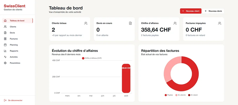 Suivez en temps réel les factures payées, en attente ou en retard. SwissClient vous indique clairement ce qui reste à encaisser.